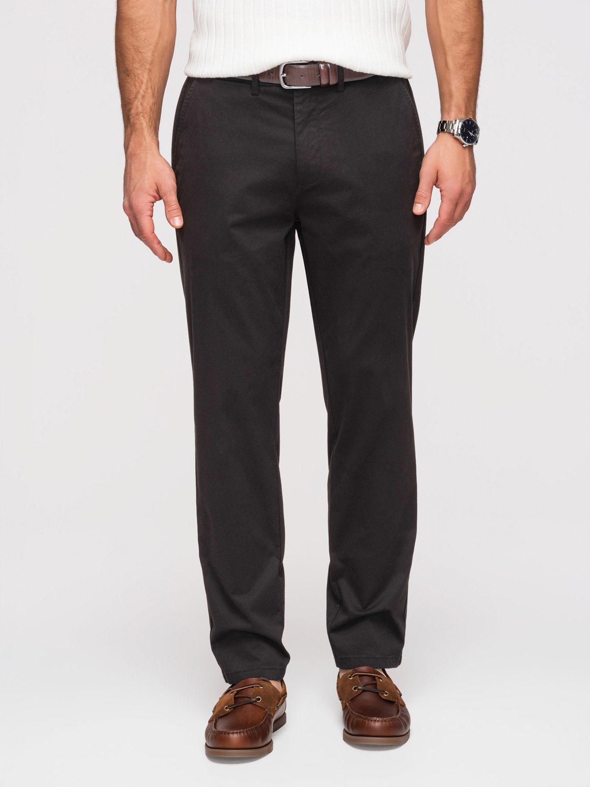 Ombre Quintessence kollektsiooni meeste chino-püksid on valmistatud puuvillast, millele on lisatud elastaani, mis soodustab paremat istuvust, mugavat liikumist ja stabiilset istuvust siluetil. Tavaline lõige tagab mitmekülgsed proportsioonid. Mudelil on tõmbluku ja nööbikinnitus, kaks esitaskut, väike peidetud tasku ja kaks tagataskut nööbikinnitusega. Pükstel on tagaosas lõngad, mis muudavad need ideaalselt meeste siluetiga sobivaks. Mugava kandmise tagab meeldiv virsikuefektiga puuvill. Brändinguga metallist embleem on peen disainidetail.Koostis ja materjalid: põhimaterjal: 97% puuvill, 3% elastaan tasku ääris: 100% polüesterkangas viimistlus: virsikuefektiga Peamised omadused: meeste chino-püksid tavalise lõikega tõmbluku ja nööbikinnitusega reguleeritav vöökoht elastse ribaga taga kaks esitaskut väike peidetud tasku kaks nööbiga tagataskut vööaasad metallist märk brändinguga See on mudel meestele, kes ehitavad garderoobi ajatute ja hõlpsasti stiliseeritavate rõivaste põhjal. Püksid sobivad hästi särkide, polosärkide, tavaliste T-särkide, džemprite ja bleiseritega, seega sobivad need nii tööle kui ka koosolekutele, pereüritustele või väljasõitudele, mis nõuavad elegantsemat välimust. Need on mitmekülgne alus nii nutikatele kui ka vabaaja riietustele ning võimaldavad teil hõlpsalt luua ühtseid stiile aastaringselt.