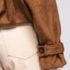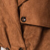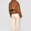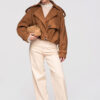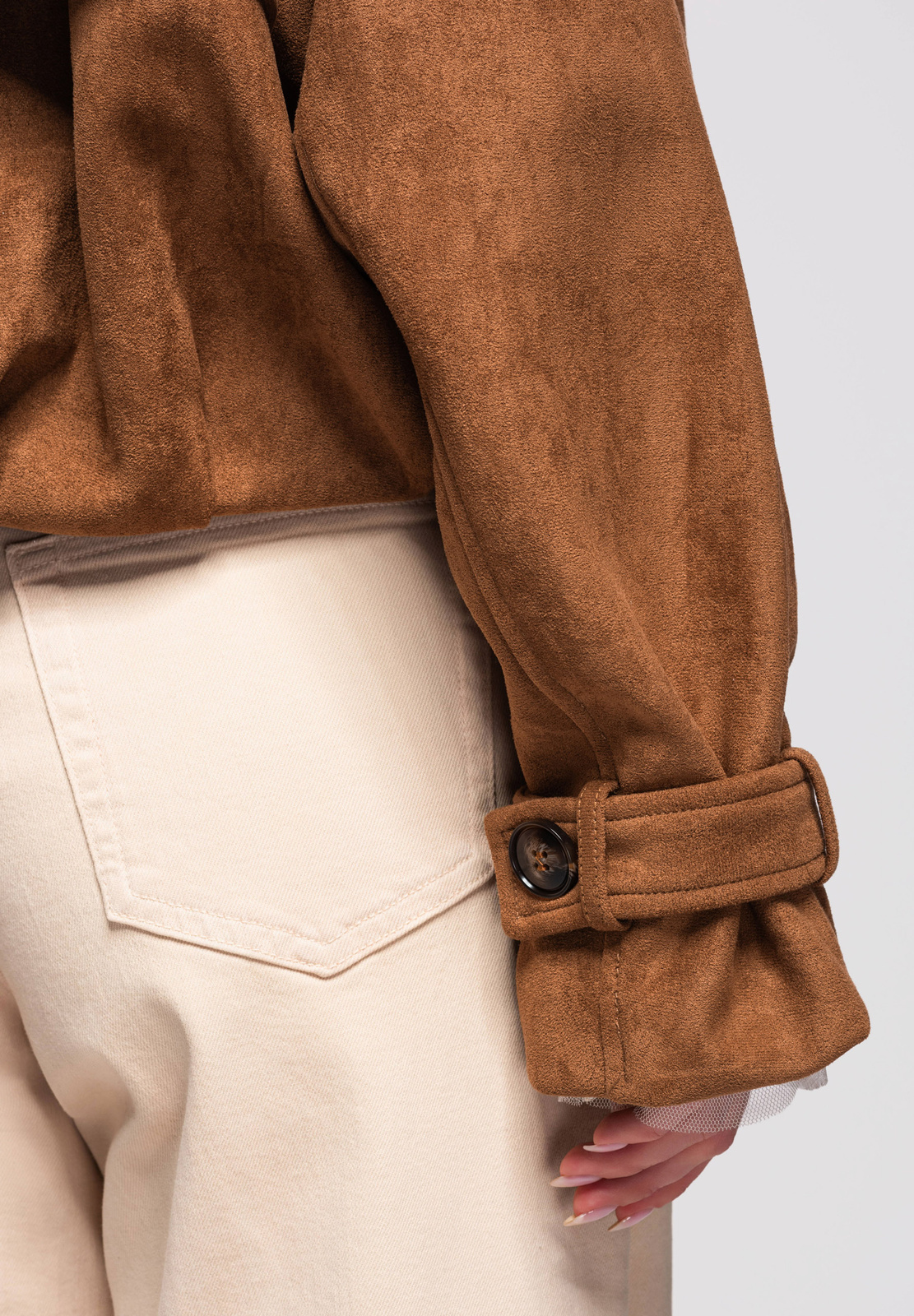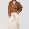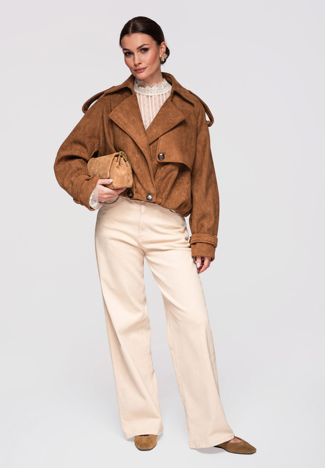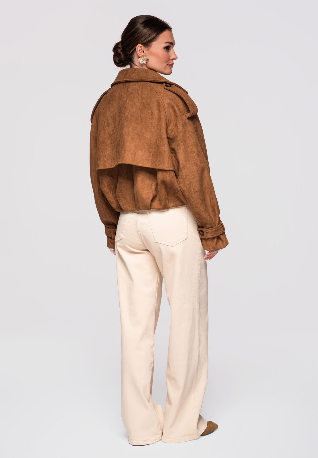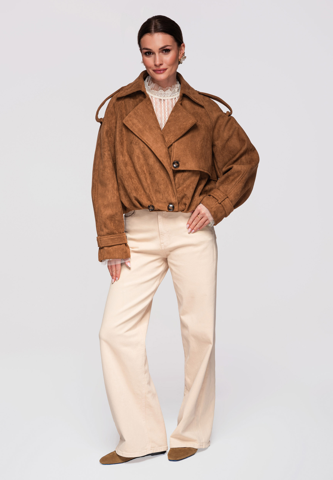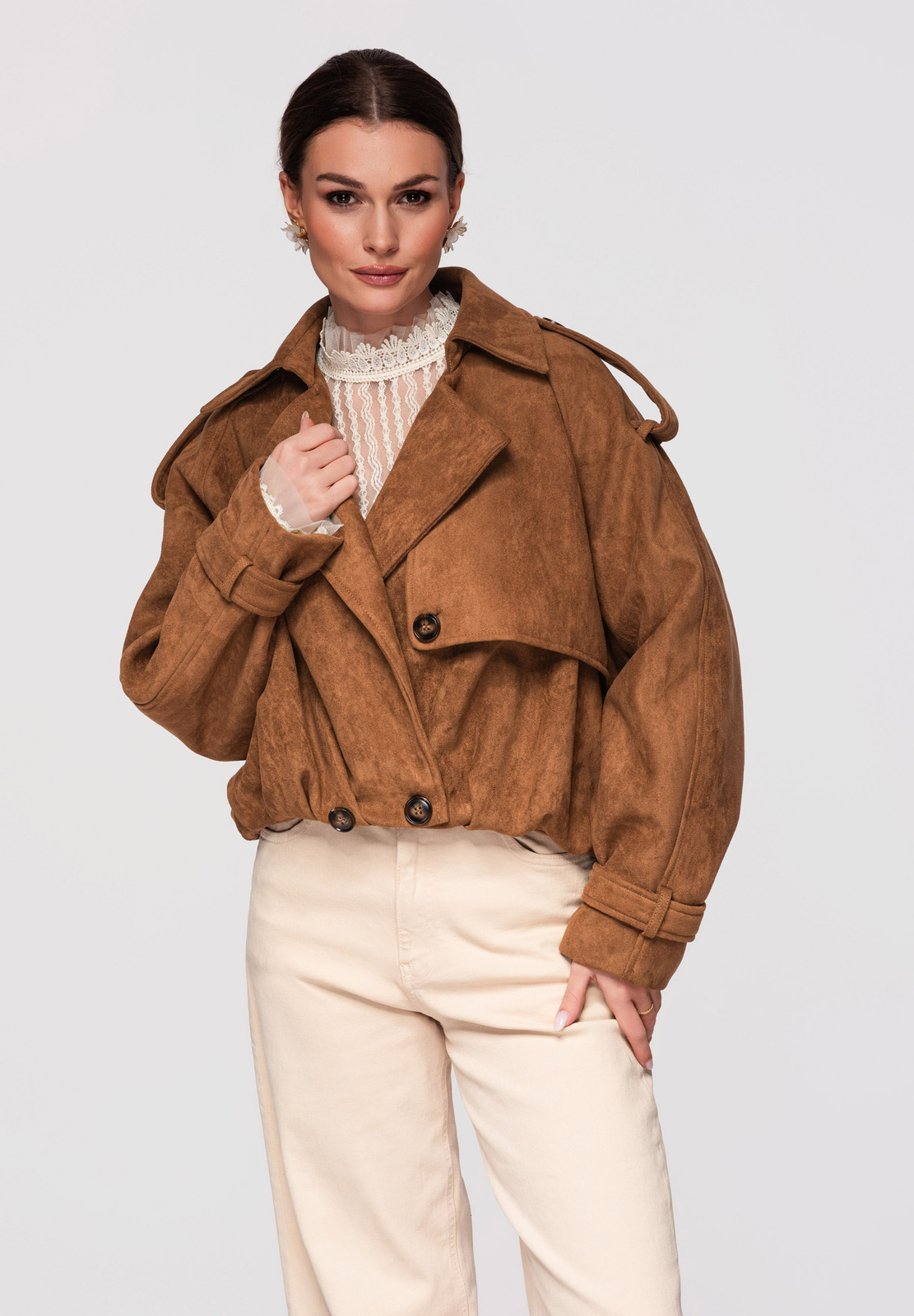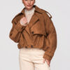 Lühike naiste jakk avardatud lõikega, mis on inspireeritud klassikalisest trenšlõikest. Lühema lõikega mudel, millel on selgelt eristuvad õlajooned ja vabaajaliselt langetatud varrukad. Topeltreaga eesmine nööpkinnis, laiad reväärid ja klassikaline krae. Õlgadel nööbitavad õlapaelad. Varrukad on viimistletud reguleeritavate õlapaelte ja nööbiga. Seljal on iseloomulik klapp, mis katab selja ülaosa. Alläär on viimistletud elastse voldiga, mis annab kehale kergust ja volüümi. Mudel on valmistatud pehmest ja venivast seemisnahast tekstuuriga kangast.