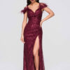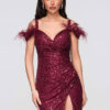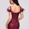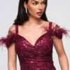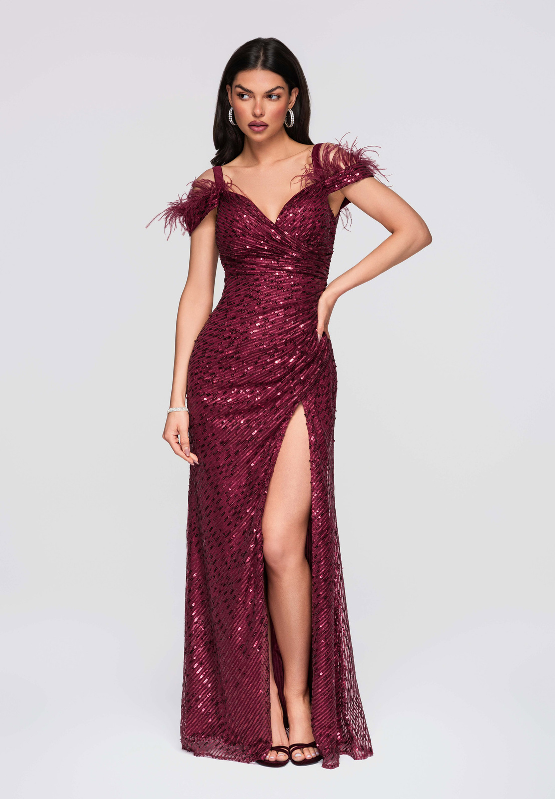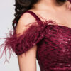 Maksikpikkuses õhtukleit on lihtsa ja liibuva lõikega, mis rõhutab siluetti. Mudel on õlapaeltega ja sellel on täiendav dekoratiivne kiht, sügav kaelus ja silmatorkav drapeeringuga vöökoht, mis stabiliseerib kanga paigutust. Disain põhineb elastsel kootud kangal, millel on läbipaistmatu sisemine kiht ja rikkalikult litritega kaunistatud välimine kiht. Kogu komplekti täiendavad asümmeetriline esilõhik ja lukuga kinnitus, mis tagavad mugavuse ja hea istuvuse. Mudelil on dekoratiivsed sulgede aplikatsioonid ja kogu kleidi pind on kaetud litritega.