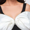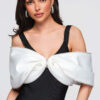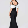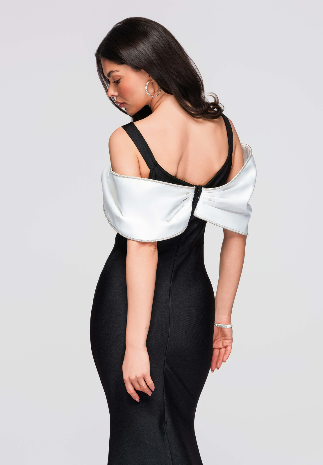 Pikk õhtukleit liibuva, bandaažikujulise lõikega, alt laieneva ja korviäärega. Disaini aluseks on paksud õlapaelad ja V-kujuline kaelus, mida täiendavad kontrastsed kaunistused rinnaosale lipsuna paigutatud dekoratiivsete varrukate näol. Mudel kinnitatakse tagant lukuga. Kleit on valmistatud paksust, läbipaistmatust, elastsest ja kergelt soonikkoes kootud kangast, mille sisemine kiht on samast materjalist. Täielikult disainitud vormi stabiilsena hoidmiseks ja silueti rõhutamiseks.