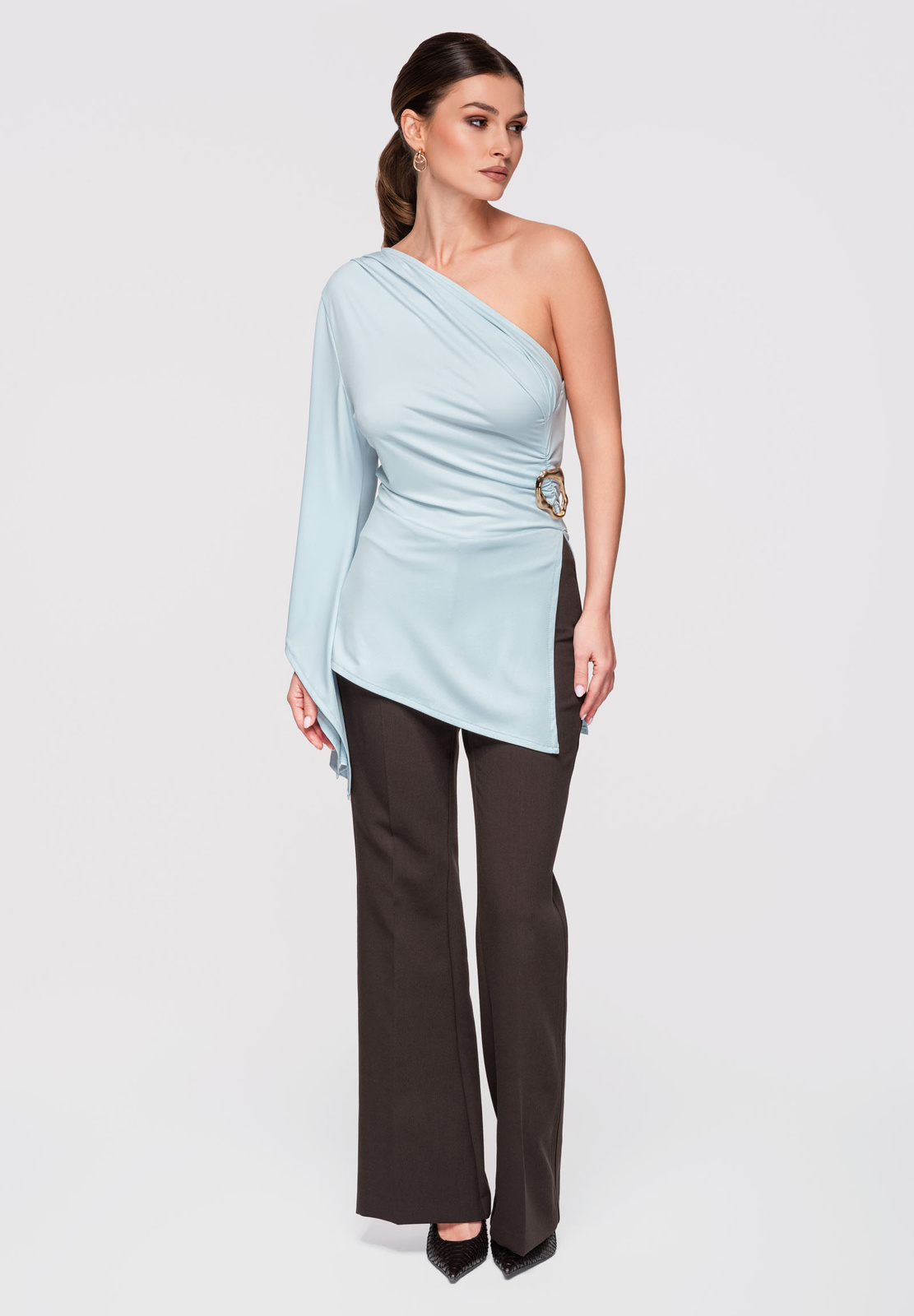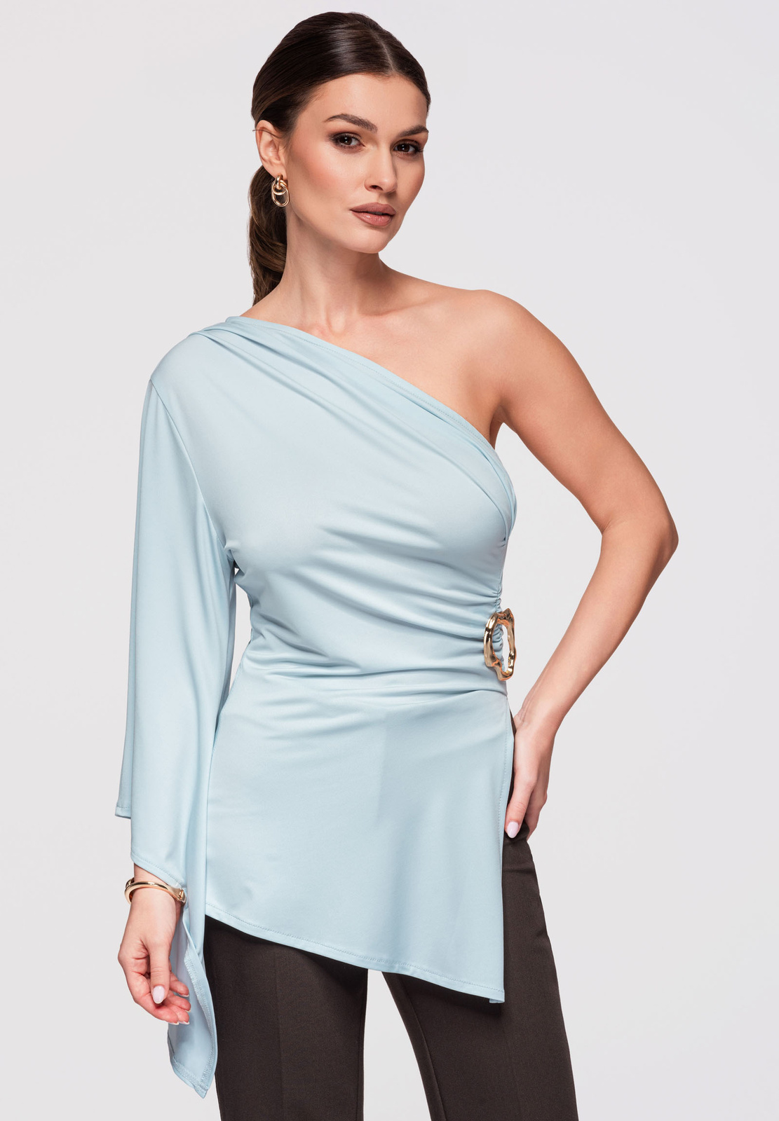 Naiste asümmeetrilise pikkuse ja kehasse töödeldud lõikega tuunika. Ühe õla kaelusega ja laia varrukaga, millel on lai ja laienev lõige. Disain põhineb venival kootud kangasel, mis kohandub figuuriga, vöökoha ümber on vormivad voldid. Drapeeringut stabiliseerib küljel olev dekoratiivne metallpandla. Koostis ja materjalid: 94% polüester, 6% elastaan. Peamised omadused: