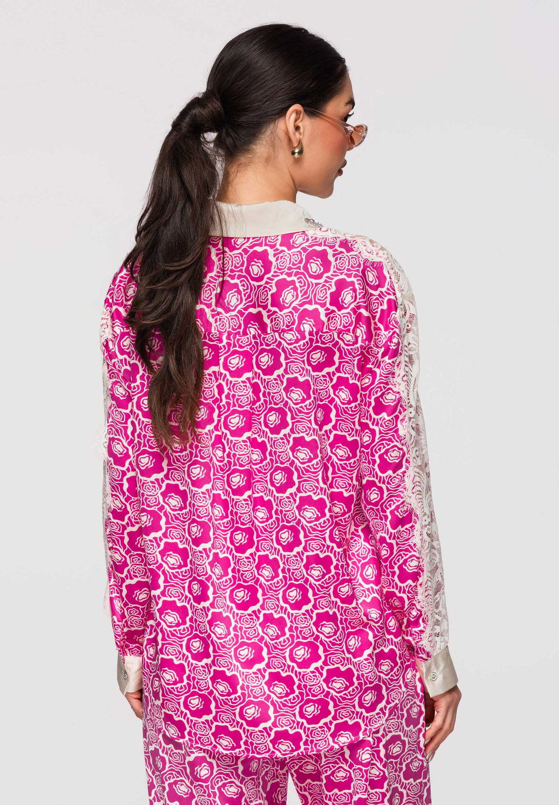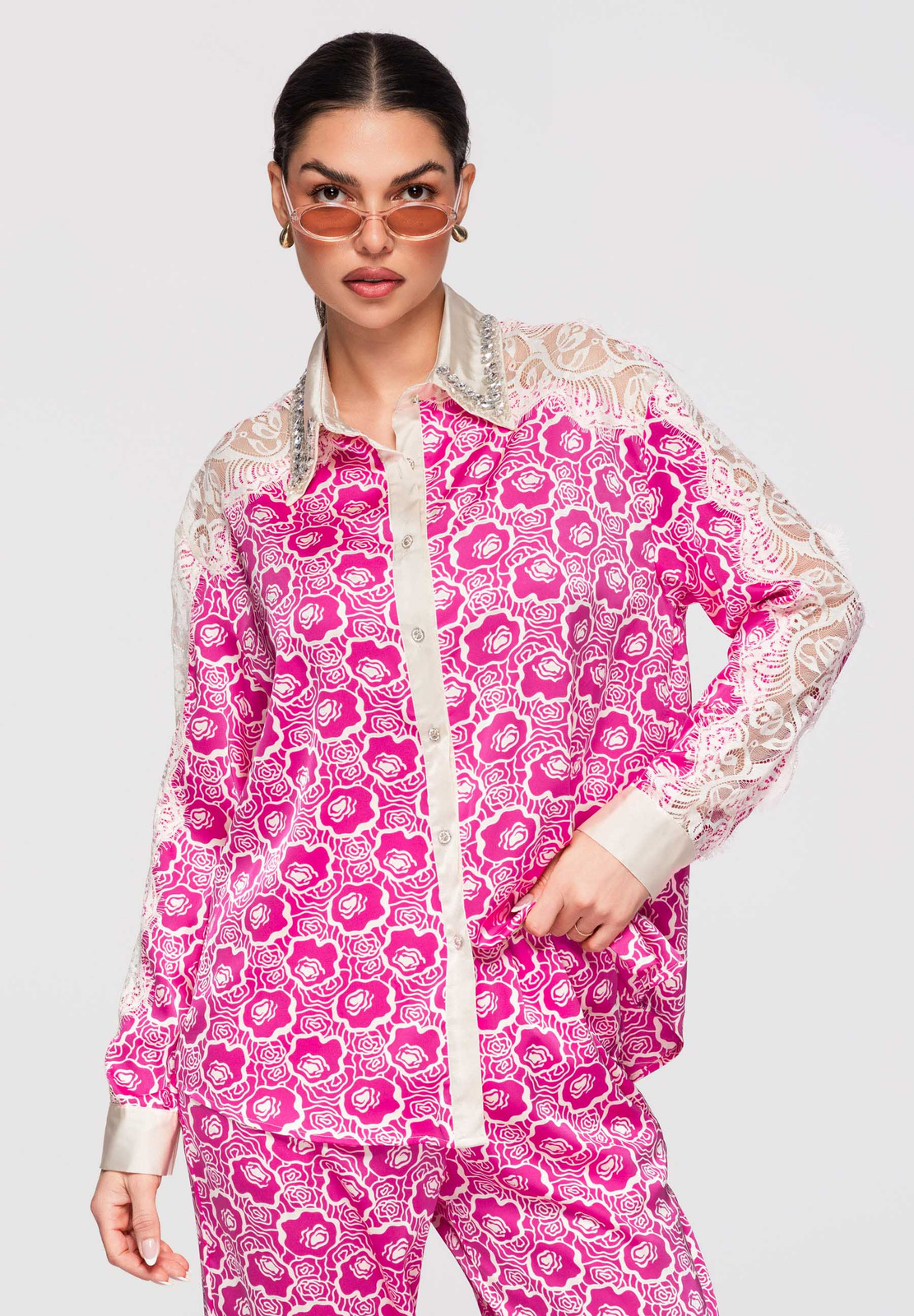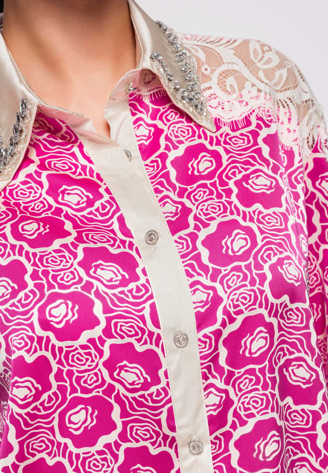 Naiste puusani ulatuv särk lõdva ja lohvaka lõikega. Mudelil on klassikaline krae, pikad varrukad ja kätised, õlajoont rõhutavad kontrastsed sisetükid ja dekoratiivsed aplikatsioonid. Disain põhineb kergel sileda pinnaga kangal, millele on lisatud läbipaistvad ažuurse struktuuriga paneelid. Täispikk nööpkinnitus ees. Koostis ja materjalid: 100% polüester Peamised omadused: