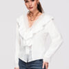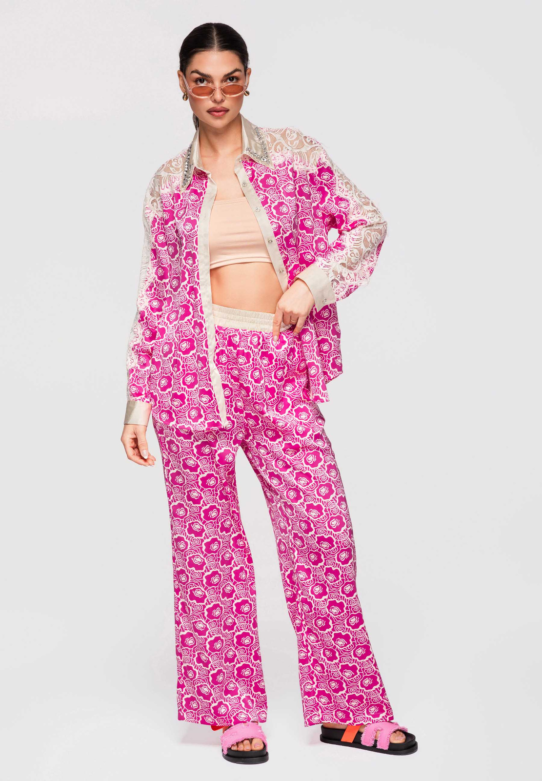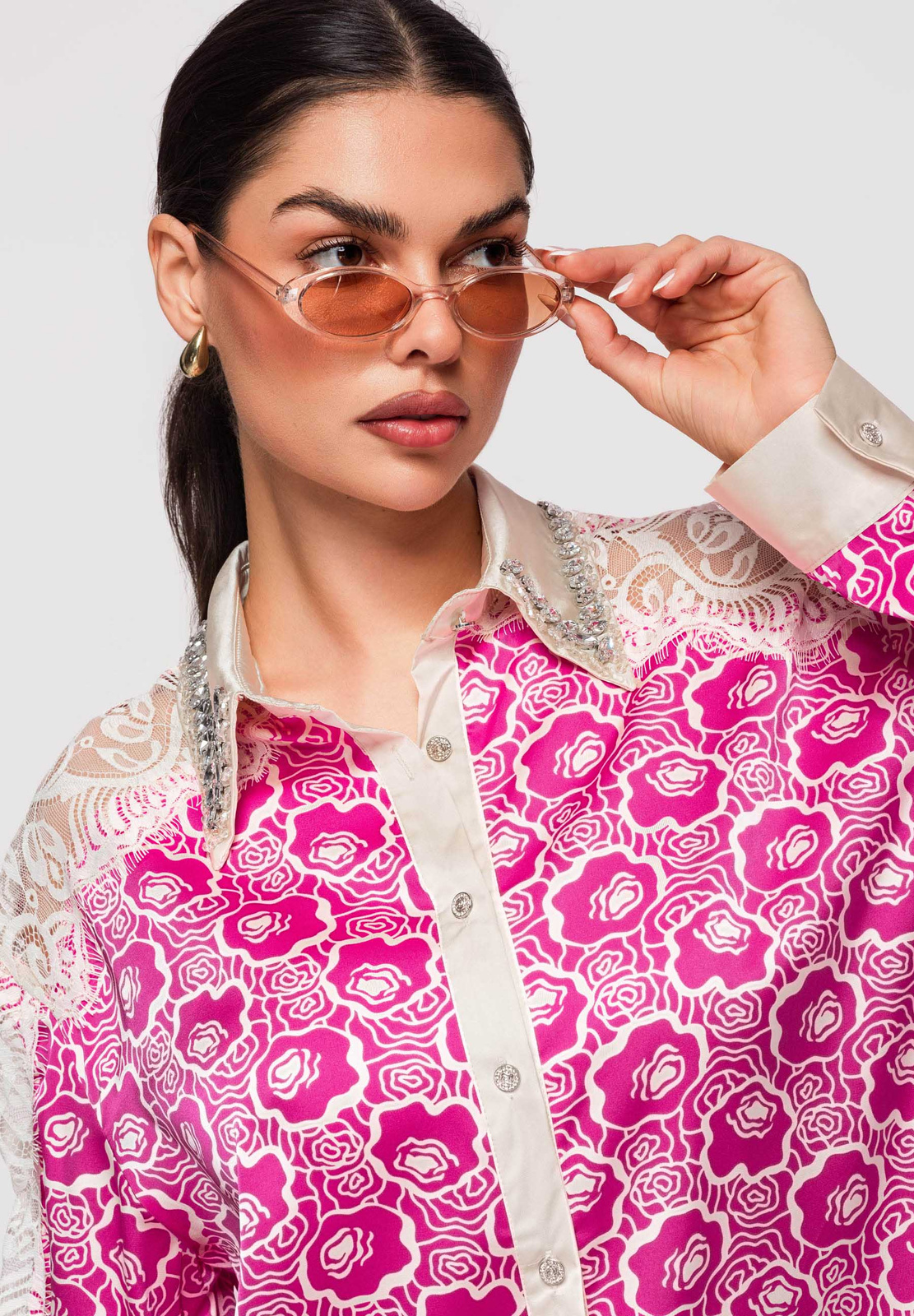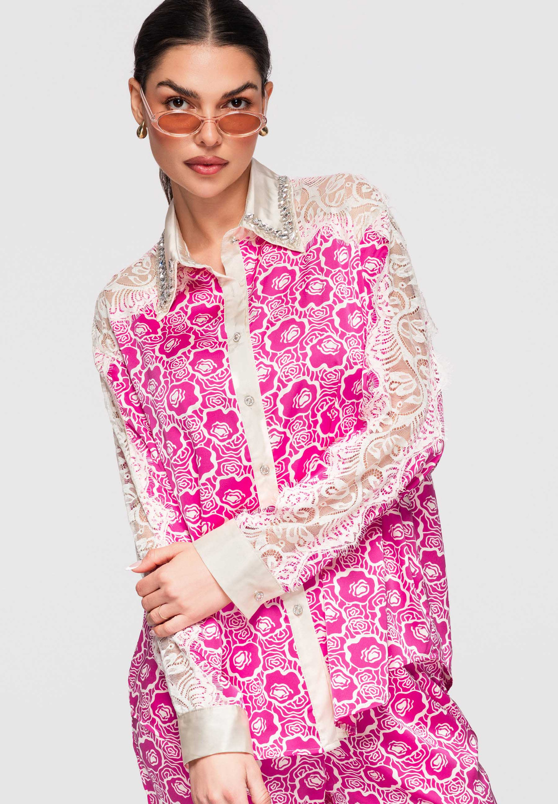 Naiste puusani ulatuv särk lõdva ja lohvaka lõikega. Mudelil on klassikaline krae, pikad varrukad ja kätised, õlajoont rõhutavad kontrastsed sisetükid ja dekoratiivsed aplikatsioonid. Disain põhineb kergel sileda pinnaga kangal, millele on lisatud läbipaistvad ažuurse struktuuriga paneelid. Täispikk nööpkinnitus ees. Koostis ja materjalid: 100% polüester Peamised omadused: