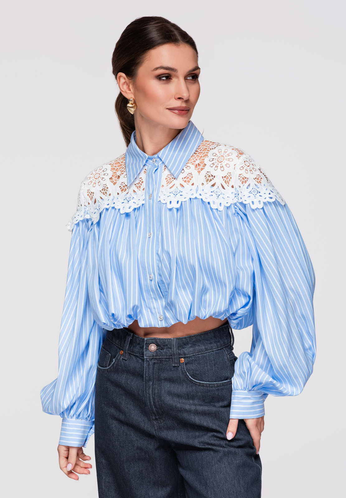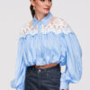 Lühike naiste särk bomberlõikega. Mudel klassikalise kraega, pikkade varrukatega mansetiga ja laia pitsist sisetükiga rikastatud õlaribaga. Valmistatud kergest, sileda tekstuuriga kangast dekoratiivse ažuurse pitsiga ja sisemisel küljel lisavoodriga. Ees nööpkinnitus, vooder on pealisriidega ühendatud pingutusnööriga elastse ribaga.Koostis ja materjalid: 80% polüester, 20% puuvillPeamised omadused: