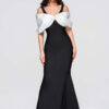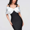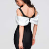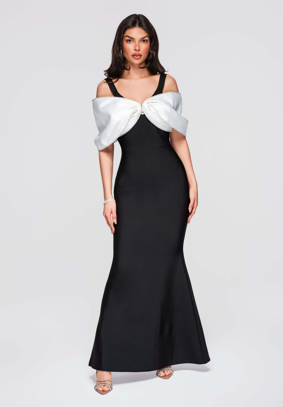 Pikk õhtukleit liibuva, bandaažikujulise lõikega, alt laieneva ja korviäärega. Disaini aluseks on paksud õlapaelad ja V-kujuline kaelus, mida täiendavad kontrastsed kaunistused rinnaosale lipsuna paigutatud dekoratiivsete varrukate näol. Mudel kinnitatakse tagant lukuga. Kleit on valmistatud paksust, läbipaistmatust, elastsest ja kergelt soonikkoes kootud kangast, mille sisemine kiht on samast materjalist. Täielikult disainitud vormi stabiilsena hoidmiseks ja silueti rõhutamiseks.