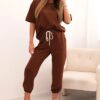 Mugav, stiilne ja praktiline – see naistekomplekt on ideaalne valik kevadeks ja suveks! See koosneb laiast lühikeste varrukatega pluusist ja kõrge vöökohaga lühikestest pükstest, millel on elastne vöökoht ja pingutusnöör, mis tagavad maksimaalse kandmismugavuse. Õrn kangas elastaani lisandiga langeb kaunilt ümber figuuri, andes kerguse ja vabaduse tunde. Minimalistlik disain väikese trükisega varrukal lisab moodsa hõngu. See komplekt on suurepärane valik jalutuskäikudeks, reisideks, laiskadeks nädalavahetusteks või vabaaja väljasõitudeks sõpradega. Kombineeri see tossude või plätudega, et saavutada moodne ja mugav välimus. Suurus on universaalne ja sobib naistele, kes kannavad suurust S, M või L.