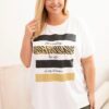 Kui otsid mugavat, kuid originaalset pluusi igapäevaseks kandmiseks – see valik köidab kindlasti sinu tähelepanu! Naiste lühikeste varrukatega pluus, mida kaunistab värviline patchwork-stiilis trükis, on ideaalne mugavuse ja linnamoe kombinatsioon. Ees on pilkupüüdev, kontrastne “Brooklyn New York” trükis, mis lisab disainile modernse hõngu. See mudel sobib hästi nii vabaaja riietusega teksadega kui ka mugava alusena baikerjaki või kardigani all. Tänu laiale lõikele langeb see kenasti üle figuuri ja pehme puuvillarikas kangas tagab mugavuse terveks päevaks. Mõeldud naistele, kes kannavad suuri suurusi – XXL, XXXL ja suuremaid.
