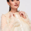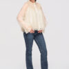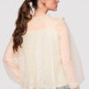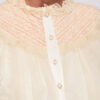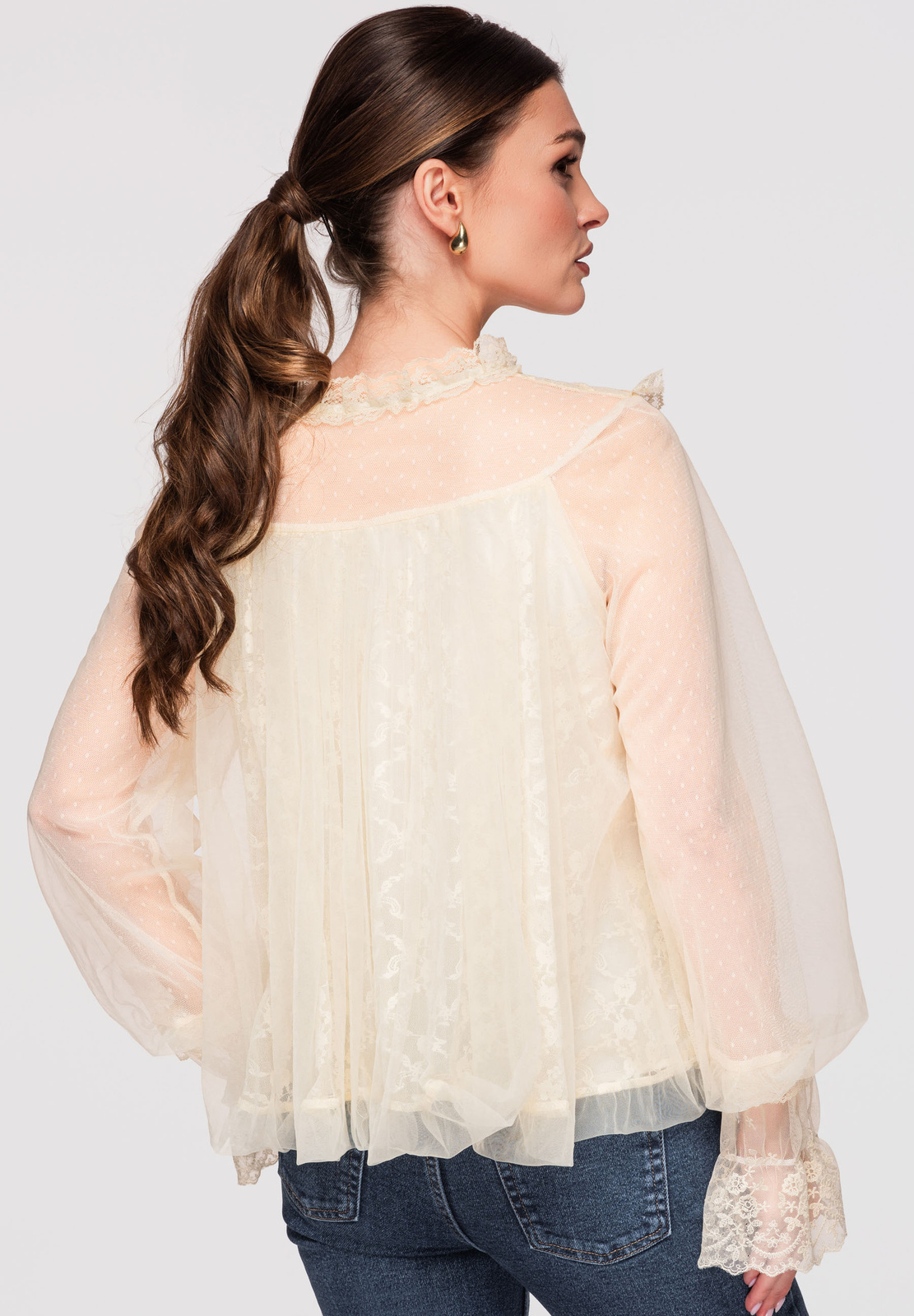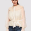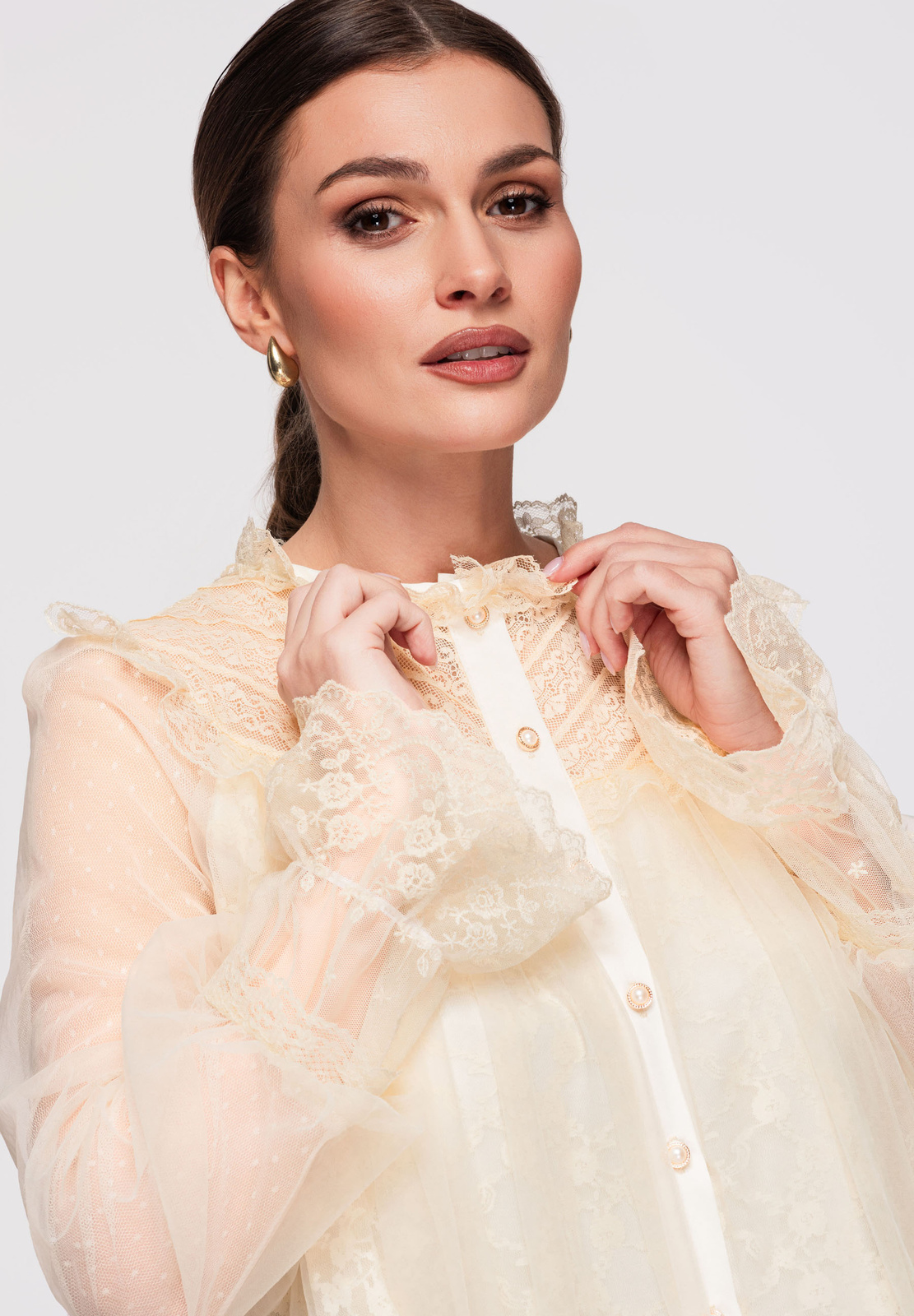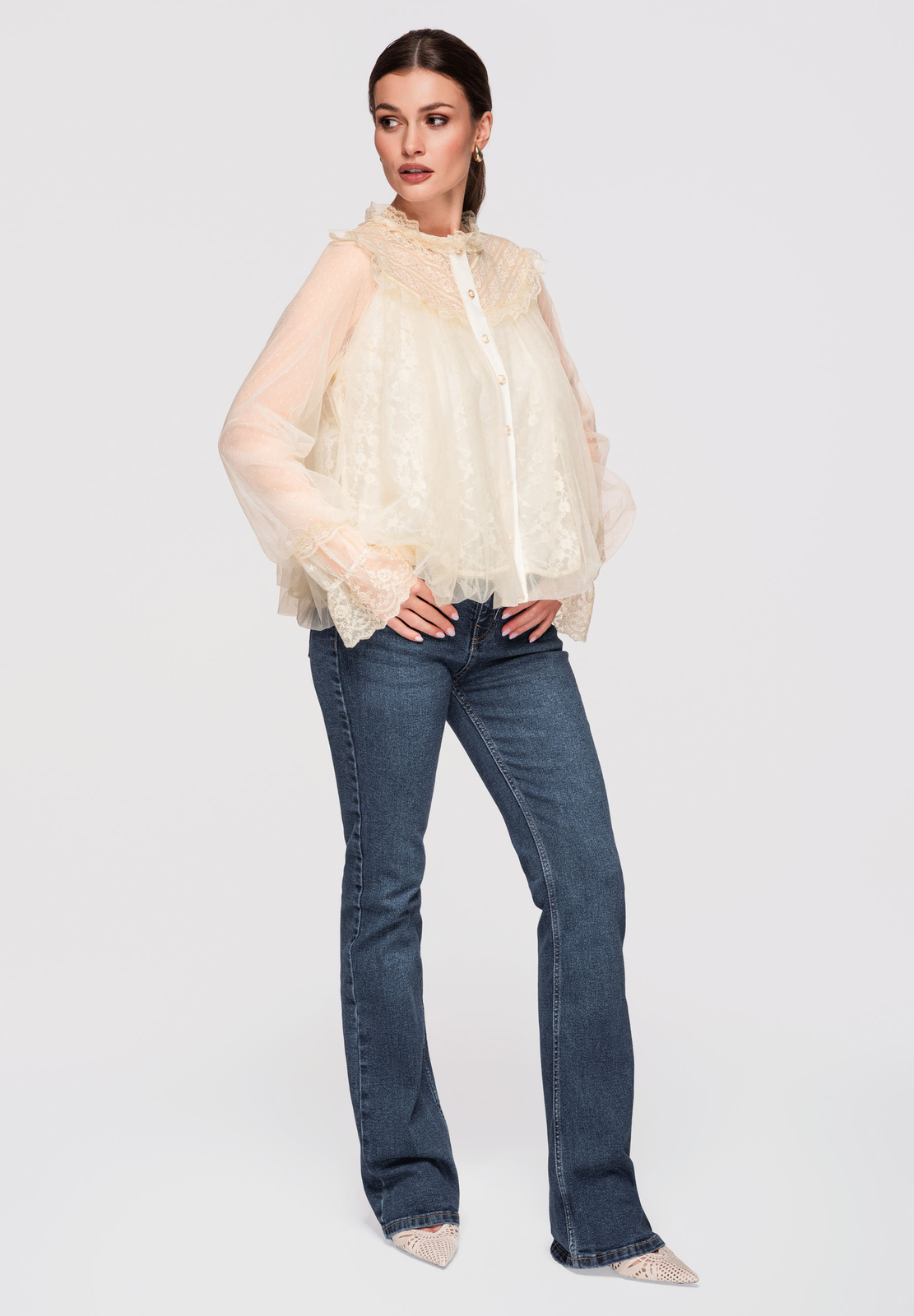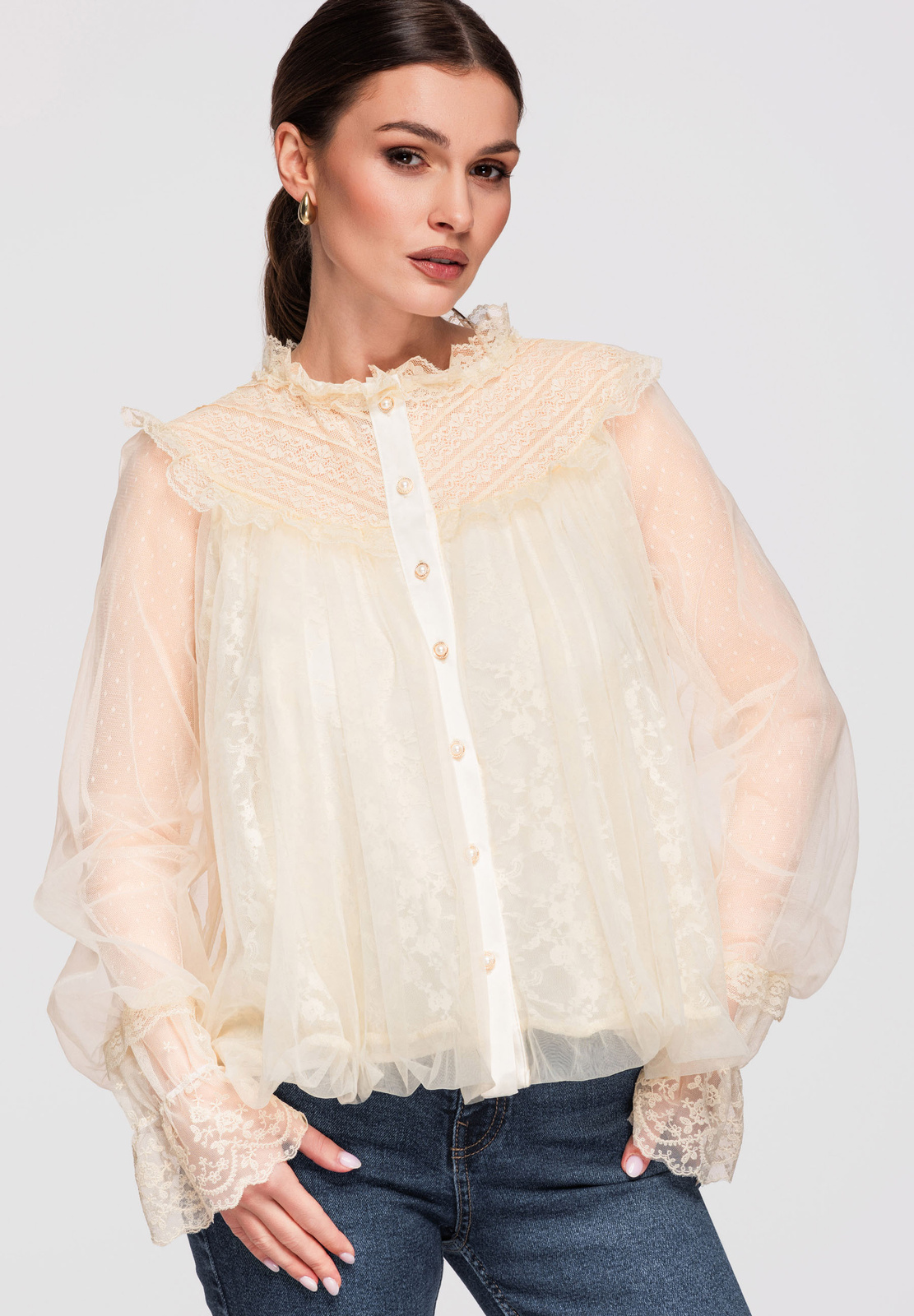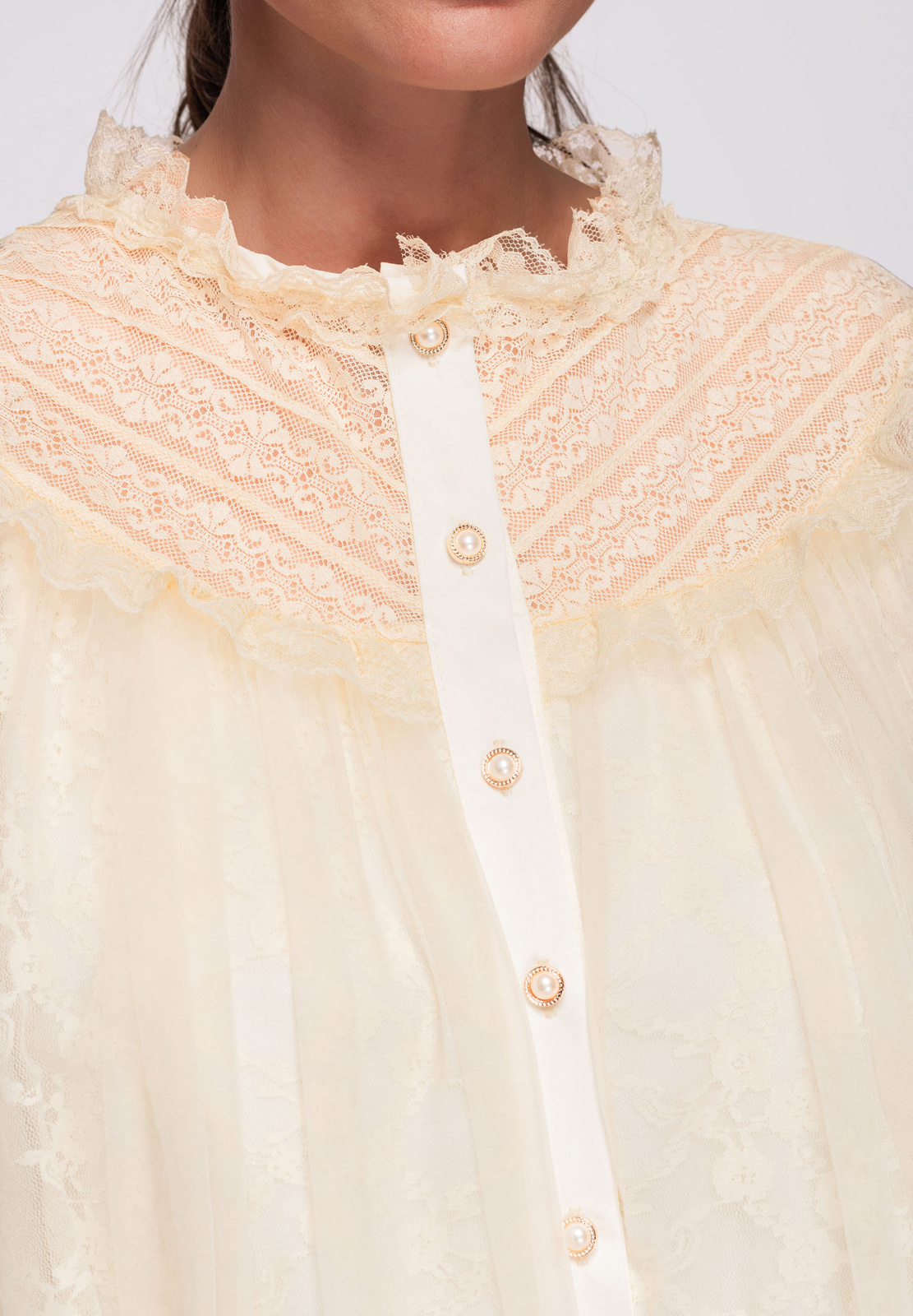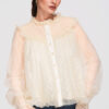 Puusani ulatuv särk laia, kergelt laieneva lõikega. Mudelil on kõrge püstine krae, mis on viimistletud volangidega, nööpkinnitus ees ja pikad varrukad, mis lõpevad laiade pitsist mansettidega. Valmistatud kergest, läbipaistvast tüll-tüüpi kangast, millel on pitspaneelid ja peen struktuur, kihiline efekt. Kinnitatud vöö on eemaldatav ja pikkuse reguleerimine pole võimalik.Koostis ja materjalid: 100% polüesterPeamised omadused: