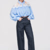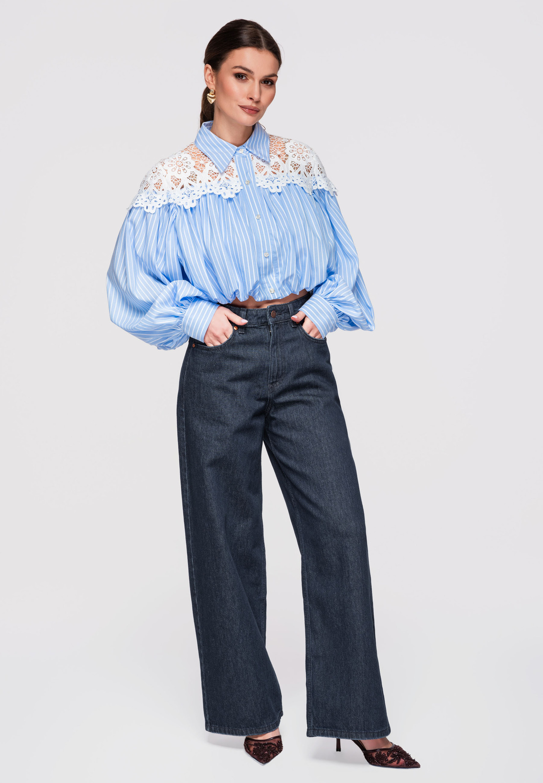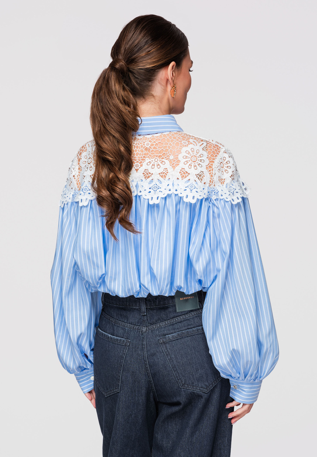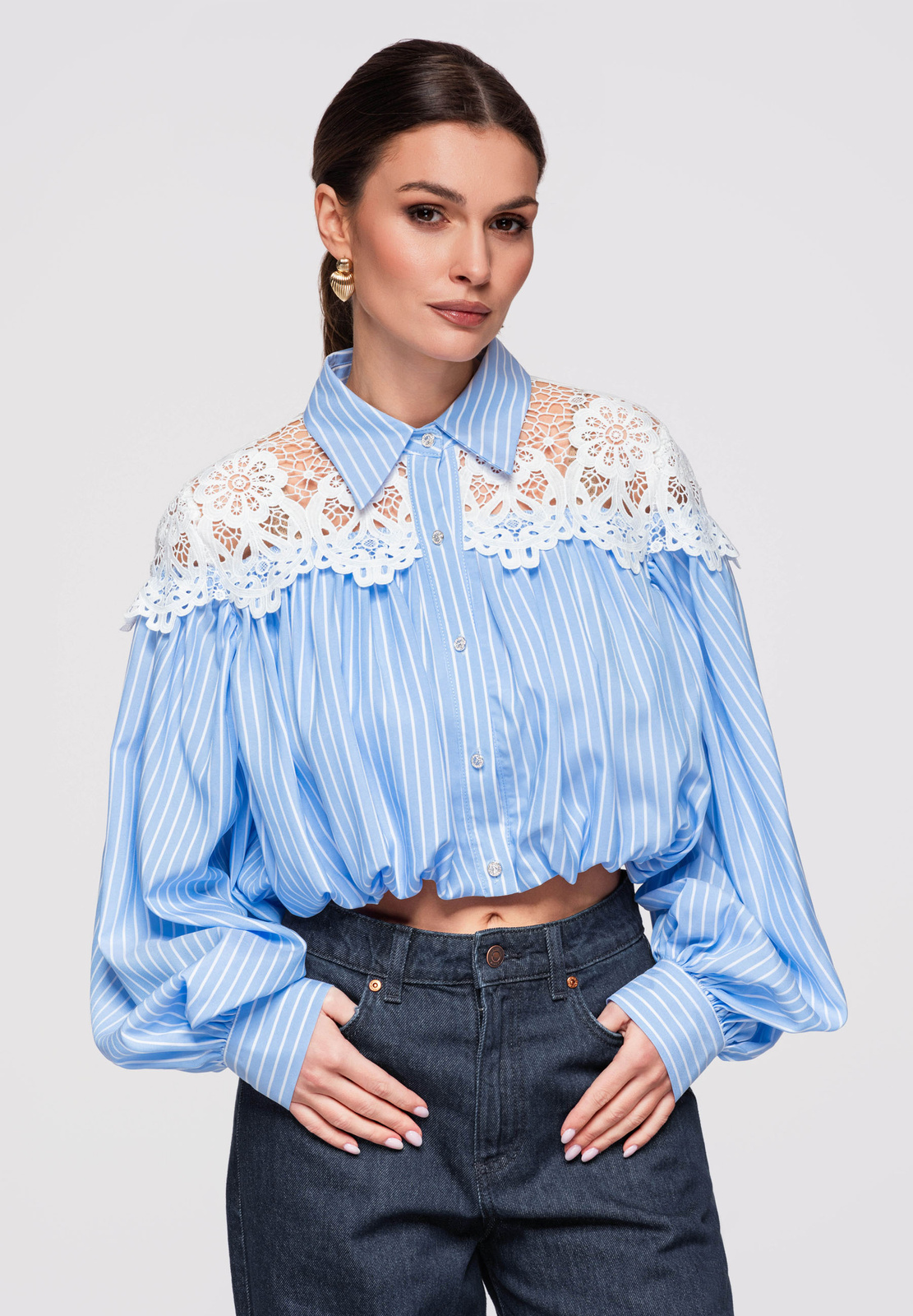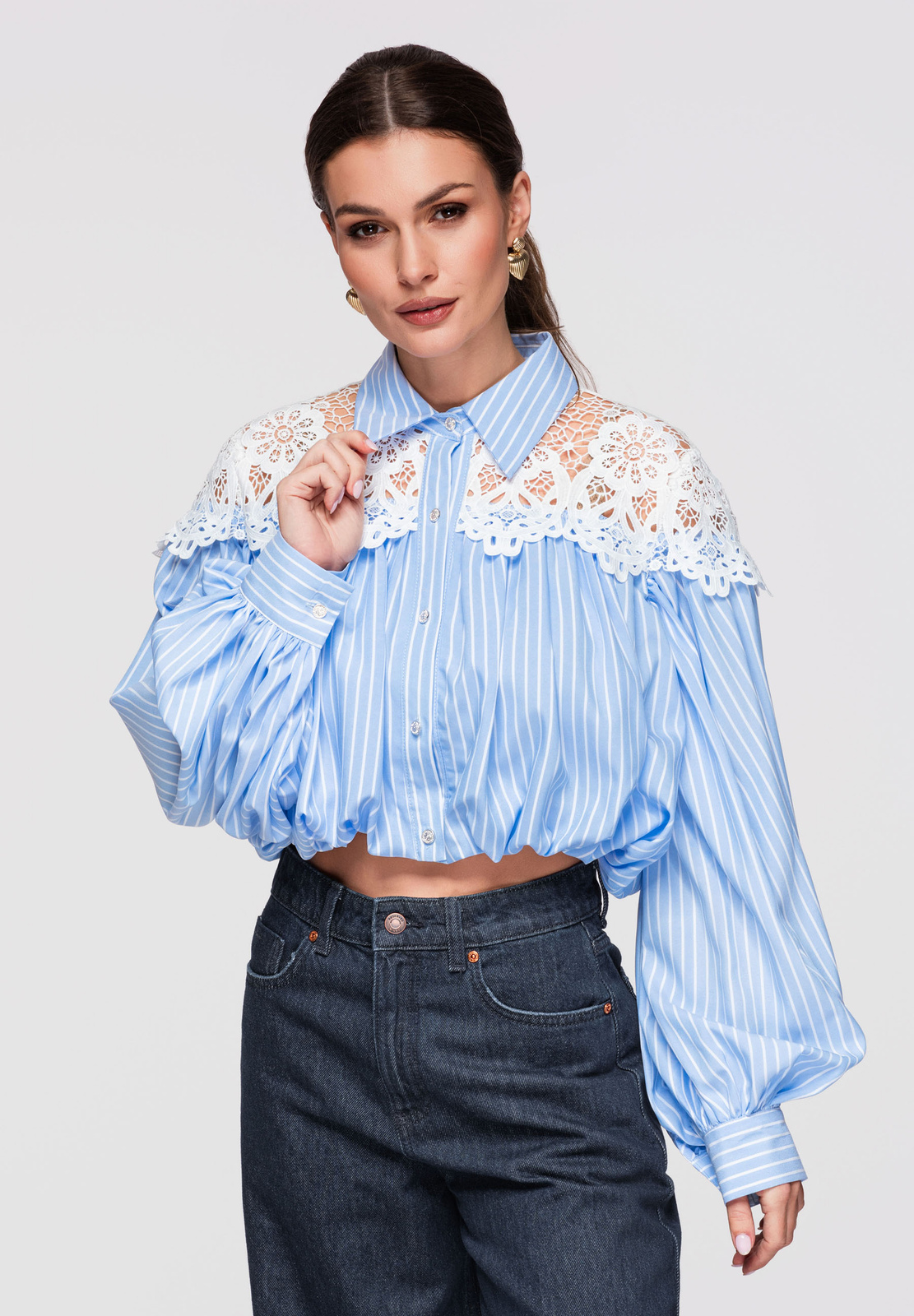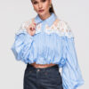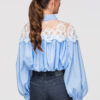 Lühike naiste särk bomberlõikega. Mudel klassikalise kraega, pikkade varrukatega mansetiga ja laia pitsist sisetükiga rikastatud õlaribaga. Valmistatud kergest, sileda tekstuuriga kangast dekoratiivse ažuurse pitsiga ja sisemisel küljel lisavoodriga. Ees nööpkinnitus, vooder on pealisriidega ühendatud pingutusnööriga elastse ribaga.Koostis ja materjalid: 80% polüester, 20% puuvillPeamised omadused: