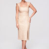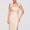 See elegantne maksipikk õhtukleit toob esile figuuri naiseliku ja rafineeritud lõikega, sobides ideaalselt pidulikeks sündmusteks ja erilisteks õhtuteks. Kehasse töödeldud ülaosa ja langev alaosa loovad graatsilise silueti, samas kui elastne kangas tagab mugavuse. Avatud selg ja esilõhik lisavad modernse ja pilkupüüdva detaili.